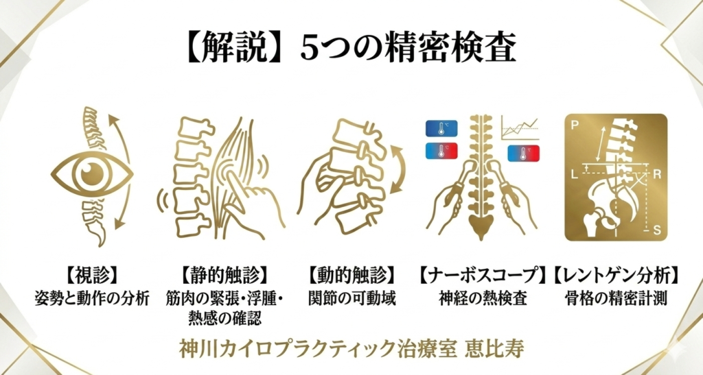 当院では、脊柱の専門家として、勘や経験だけに頼るのではなく、**「5つの客観的なデータ」**を用いてあなたの状態を分析します。