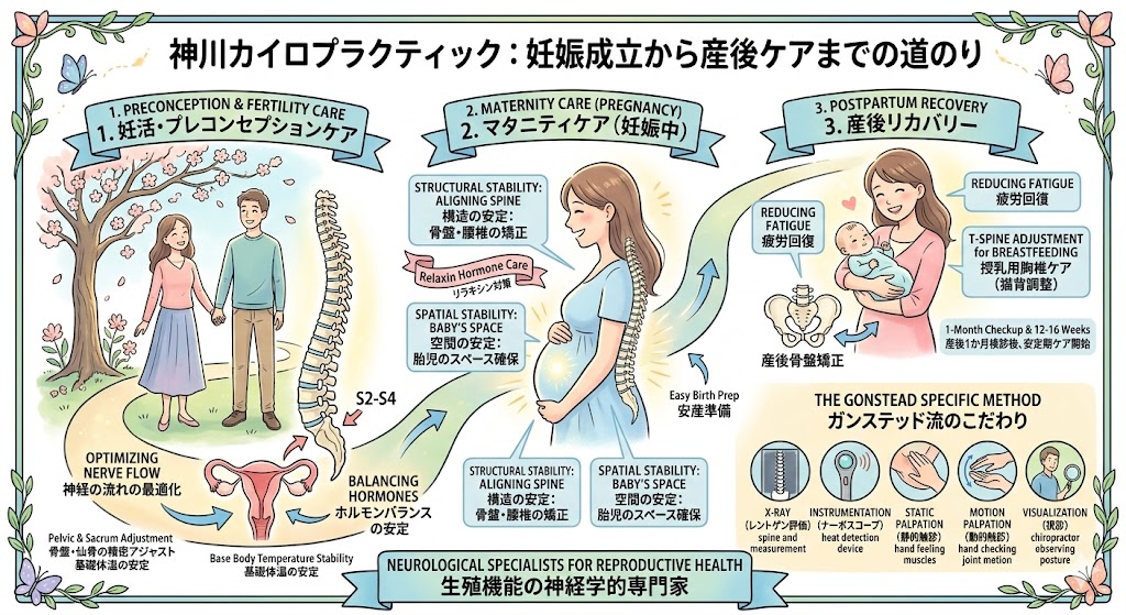 神川カイロプラクティック(Kamikawa Chiropractic)が提唱する、結婚・妊活・出産・産後に特化した「妊娠成立からケア」までのメニュー構成について、Gonstead(ガンステッド)の哲学に基づいた視点で整理します。